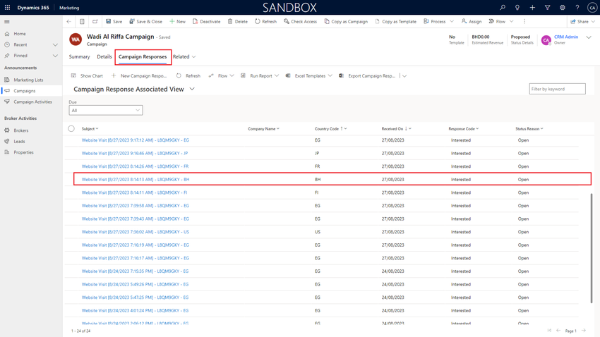 As shown in the Campaign Responses View, recorded (date-time and code of campaign activity - Country Code).