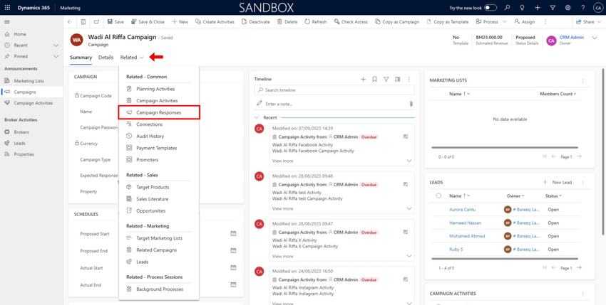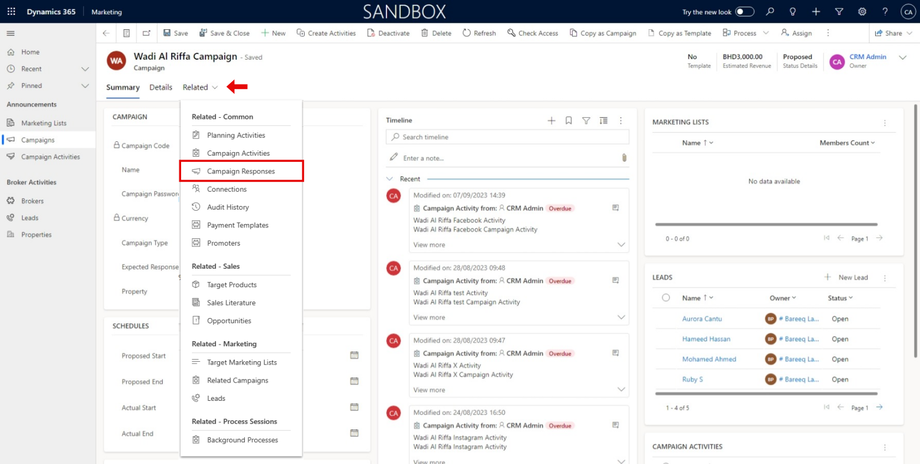 To view this response, click on the campaign as shown below, then click on 'Related' and choose Campaign Responses.