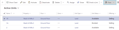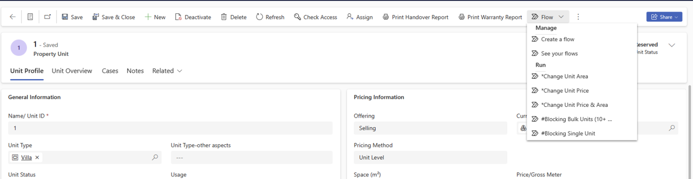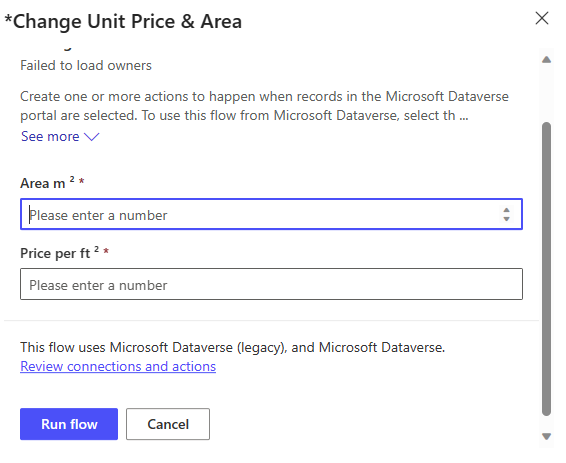 - Enter the new area and the new price of the unit and click on the Run Flow button.