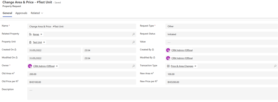 The system will generate a property request and approval activity for the selected unit with a new price and area.