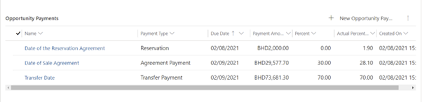 Once the payment plan is selected and create payments is assigned to Yes, a set of opportunity payments would be generated, and they would have initial due dates and divided payment amount based on the plan.